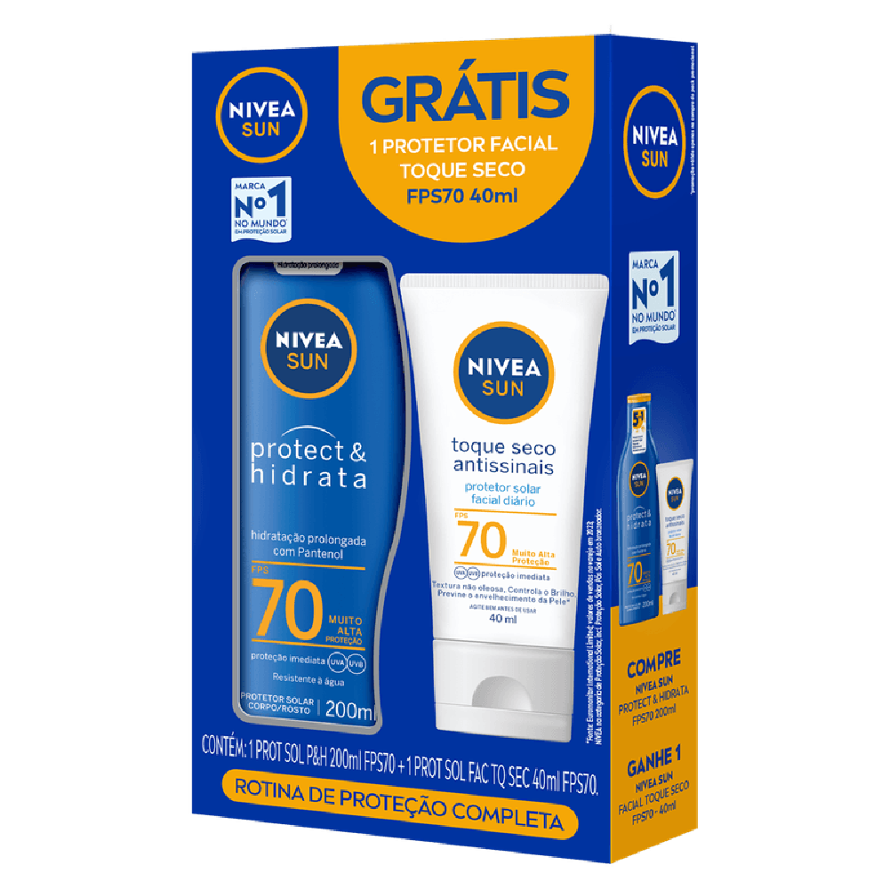 O Kit Protetor Solar Nivea Sun FPS 70 200ml + Protetor Solar Nivea Sun FPS 70 Toque Seco Facial 40ml oferece alta proteção solar para o corpo e o rosto. O protetor corporal ajuda a proteger a pele contra os raios UVA e UVB, sendo ideal para exposição solar intensa. O protetor facial possui textura leve e toque seco, auxiliando no controle da oleosidade e proporcionando conforto para o uso diário. Indicado para todos os tipos de pele.