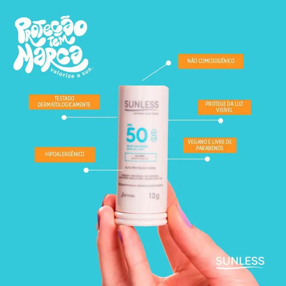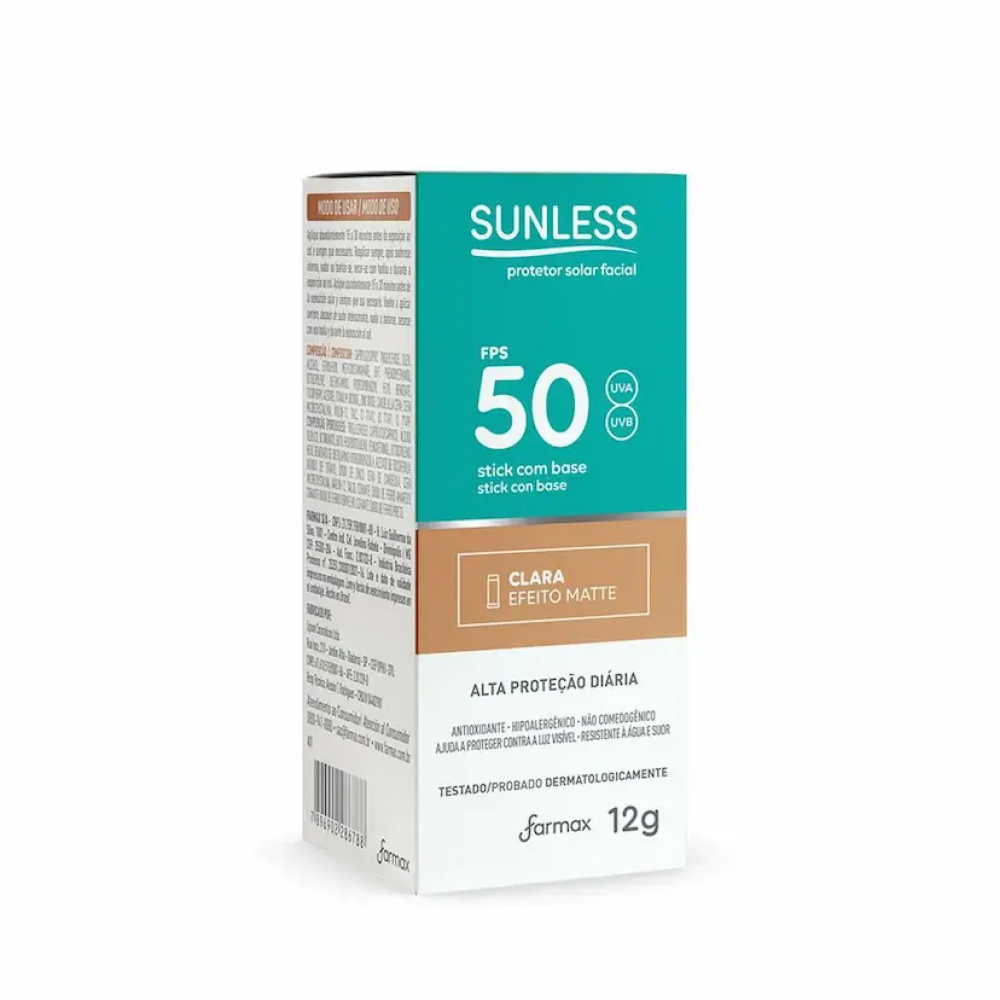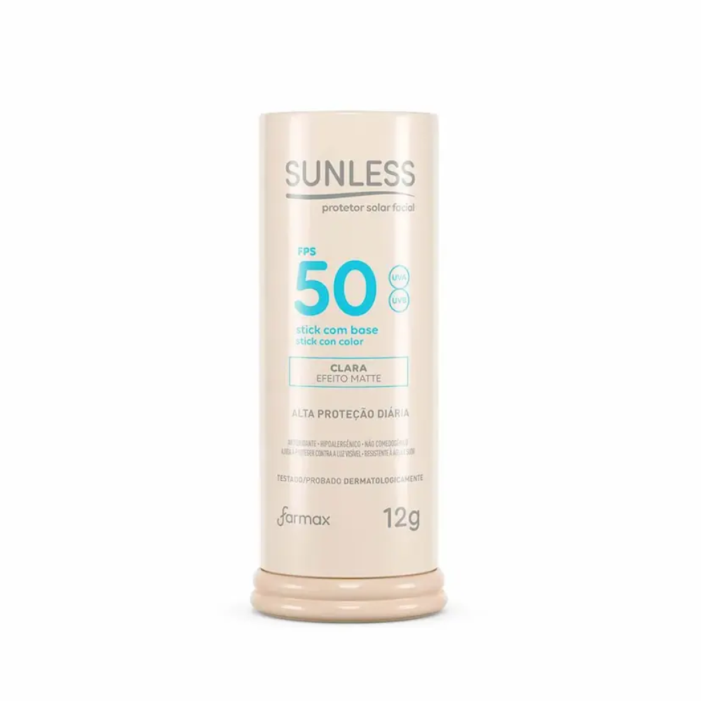 O Protetor Solar Sunless Facial FPS 50 Stick com Base Clara Efeito Matte 12g oferece alta proteção contra os raios UVA e UVB, ajudando a prevenir manchas e o envelhecimento precoce da pele. A sua fórmula em stick com base clara proporciona cobertura uniforme, auxiliando na correção do tom da pele, enquanto o efeito matte ajuda a controlar a oleosidade. Prático e compacto, é ideal para uso diário e reaplicações ao longo do dia.