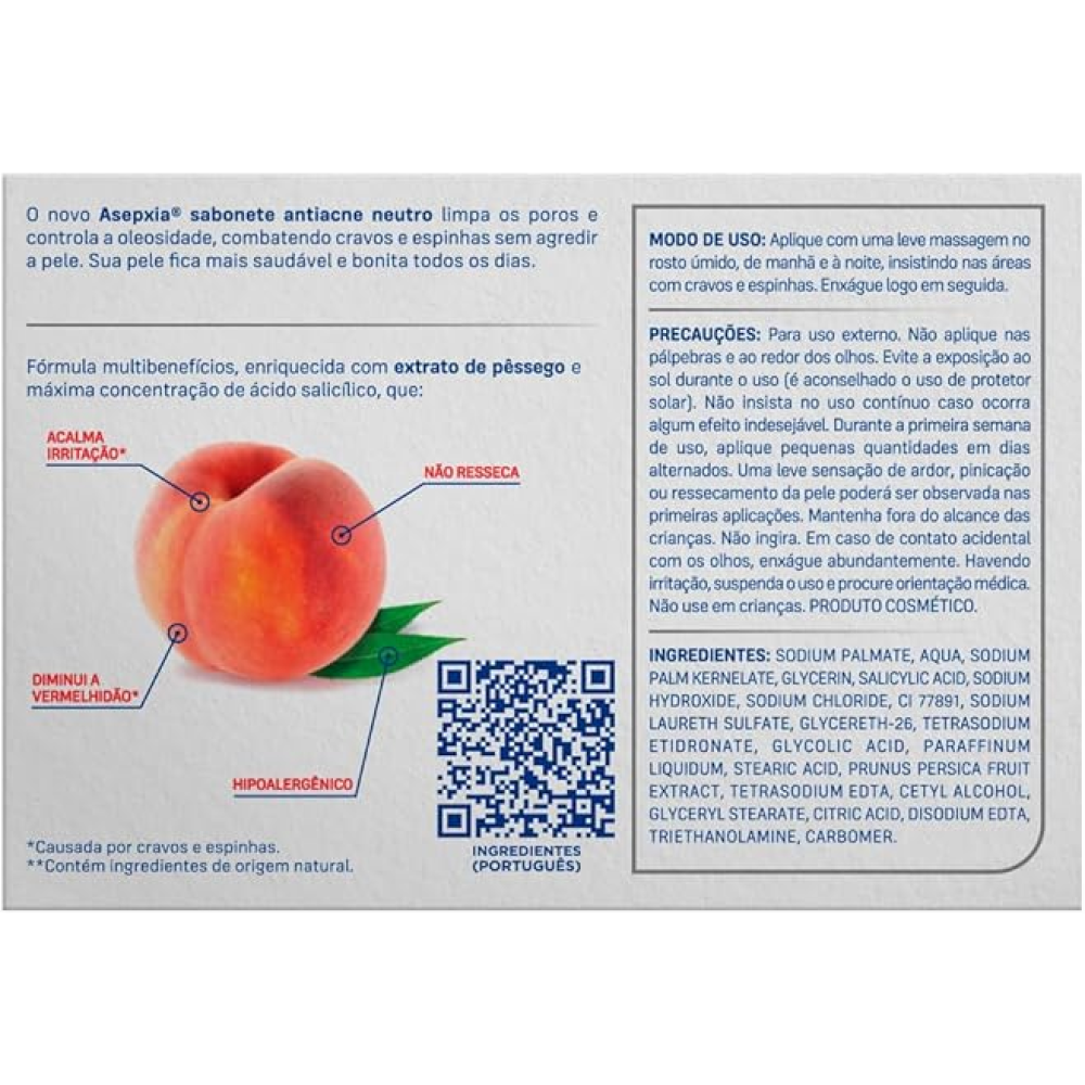 O Sabonete Facial Asepxia Neutro Ação Calmante 80g foi desenvolvido para promover uma limpeza eficaz e delicada da pele. Sua fórmula com ação calmante auxilia na remoção de impurezas e no controle da oleosidade, sem agredir ou ressecar a pele. Indicado para uso diário, especialmente para peles sensíveis, oleosas ou com tendência à acne, ajudando a manter a pele limpa, equilibrada e com sensação de frescor.
