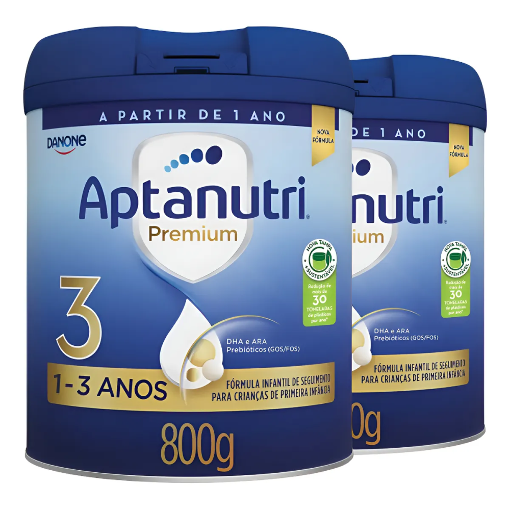 O Kit Fórmula Infantil Aptanutri Premium 3 contém 2 latas de 800g cada, sendo indicado para crianças a partir de 1 ano, como complemento da alimentação diária, sempre sob orientação de médico ou nutricionista.