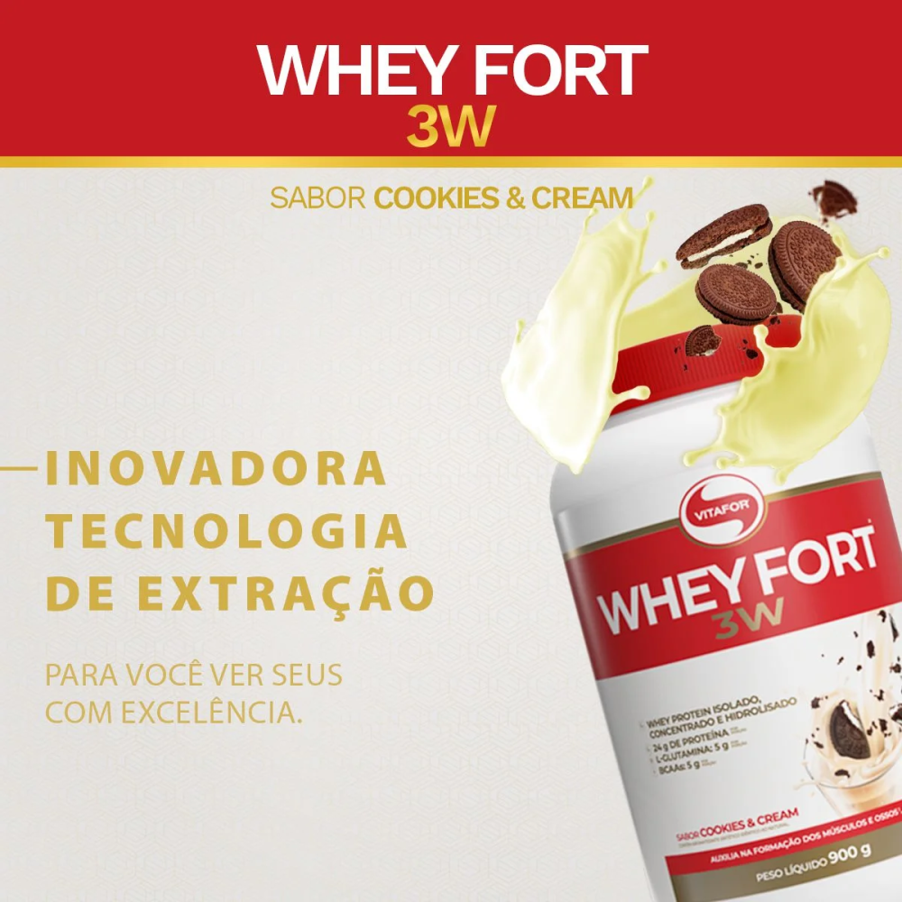 O Whey Fort 3W Cookies & Cream 900g, da Whey Fort, é um suplemento proteico completo que combina proteína concentrada, isolada e hidrolisada, oferecendo alta qualidade nutricional para quem busca ganho de massa muscular, recuperação e desempenho físico.