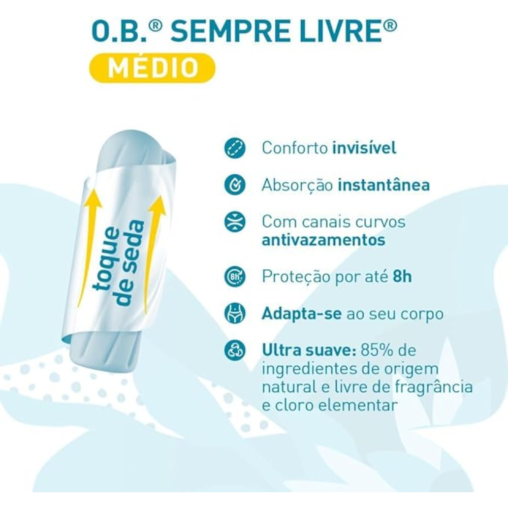 O Absorvente Íntimo O.B. Médio é indicado para fluxo menstrual moderado, proporcionando proteção eficaz com conforto e discrição. Desenvolvido para se adaptar ao corpo, permite liberdade de movimentos e segurança durante o uso, quando utilizado corretamente.
