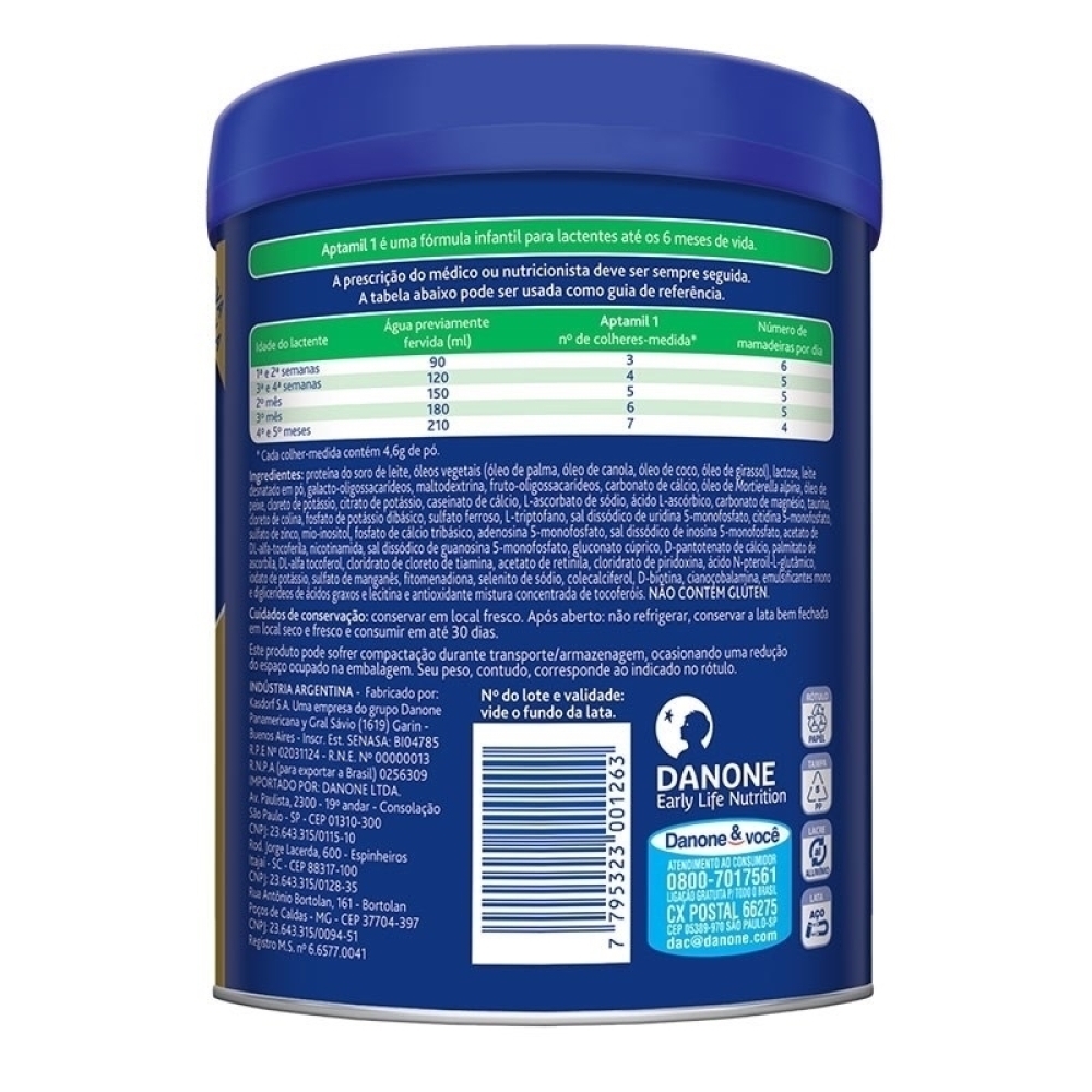 A Aptamil Premium 1 (Danone) 800 g é uma fórmula infantil de partida, indicada para lactentes, desenvolvida para atender às necessidades nutricionais quando o aleitamento materno não for possível ou precisar ser complementado, conforme orientação do profissional de saúde.