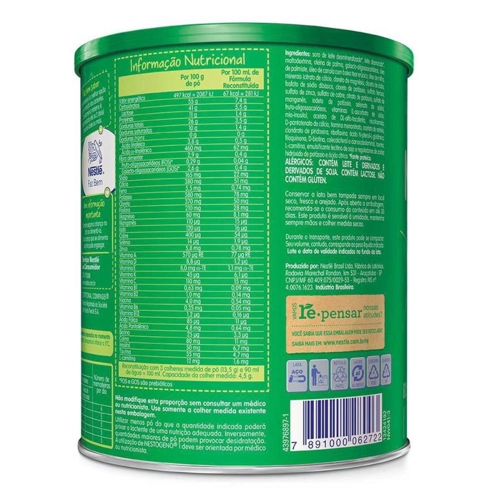 Advertências: o aleitamento materno é recomendado. Utilize esta fórmula apenas sob orientação de médico ou nutricionista. Prepare conforme instruções do fabricante. Não aqueça a mamadeira no micro-ondas. Manter fora do alcance de crianças.