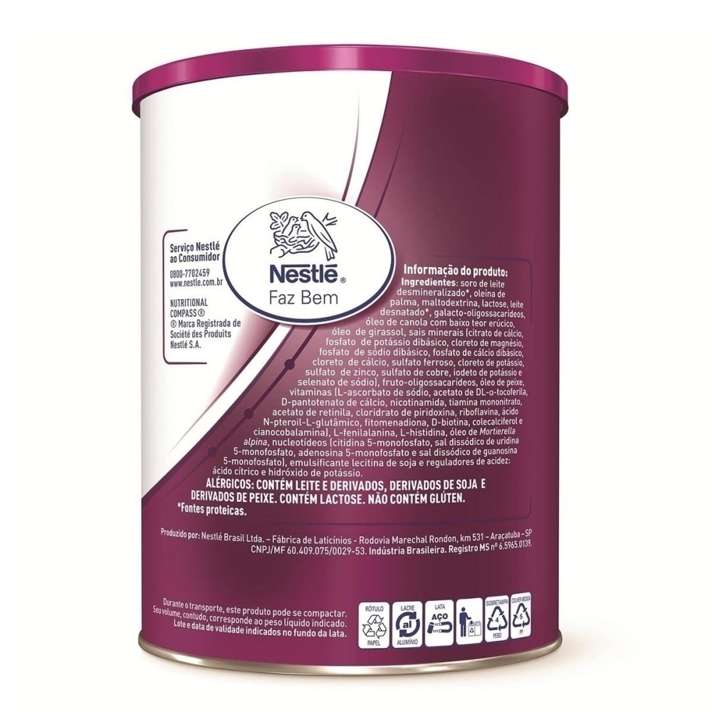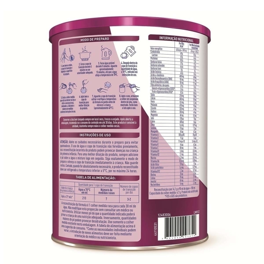Advertências: o aleitamento materno é recomendado por 2 anos ou mais. Use este produto apenas sob orientação de médico ou nutricionista. Não indicado para menores de 12 meses. Não utilizar por via parenteral. Não aquecer a mamadeira no micro-ondas. Manter fora do alcance de crianças.