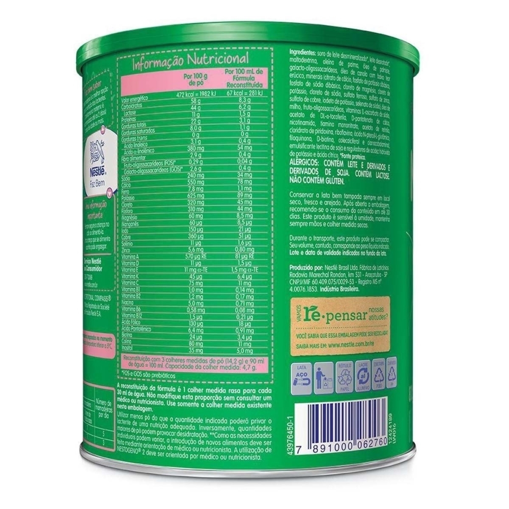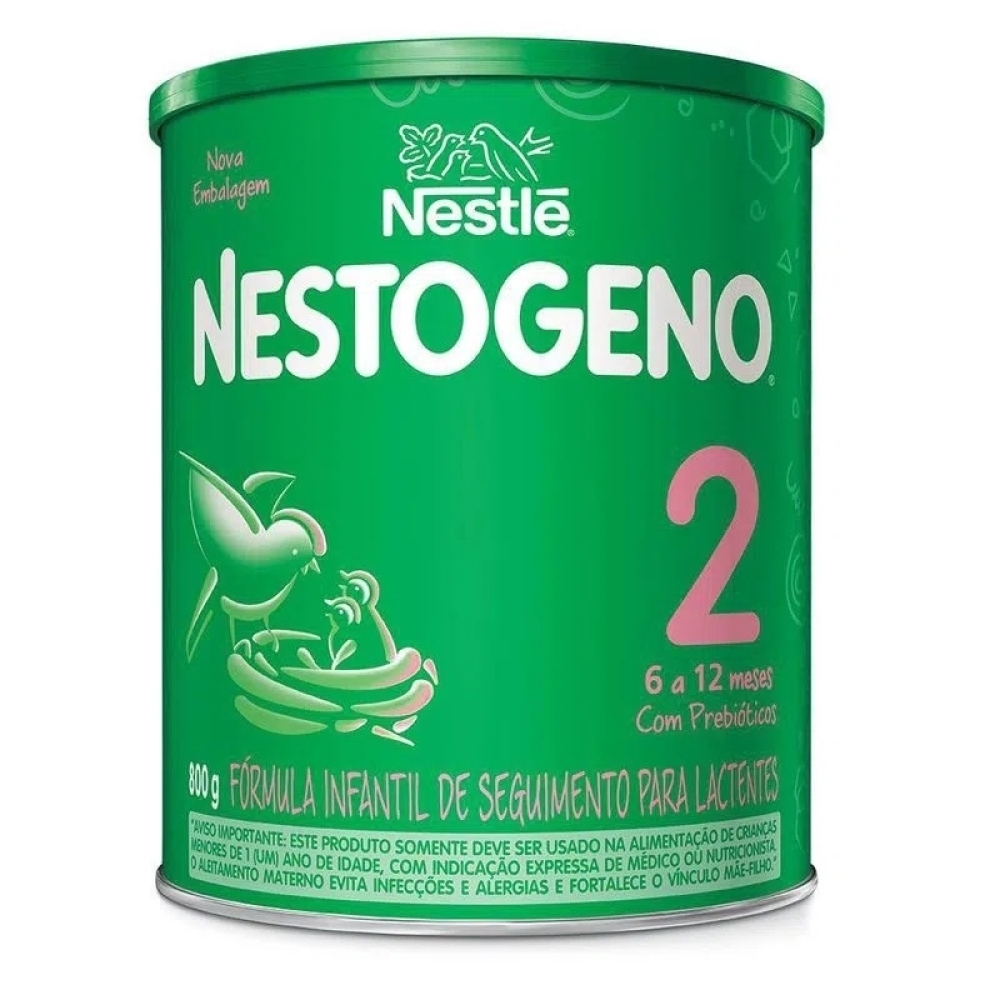 A Fórmula Infantil Nestlé Nestogeno 2 800 g é uma fórmula de seguimento para bebês de 6 a 12 meses, indicada quando o aleitamento materno não for possível ou precisar ser complementado, sempre com orientação do profissional de saúde. Possui preparo prático e rótulo com instruções claras para a diluição correta, atendendo à legislação vigente para fórmulas infantis.