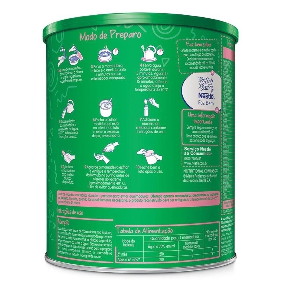 Advertências: o aleitamento materno é recomendado. Utilize esta fórmula apenas sob orientação de médico ou nutricionista. Não indicada para menores de 6 meses. Não aquecer a mamadeira no micro-ondas. Manter fora do alcance de crianças.