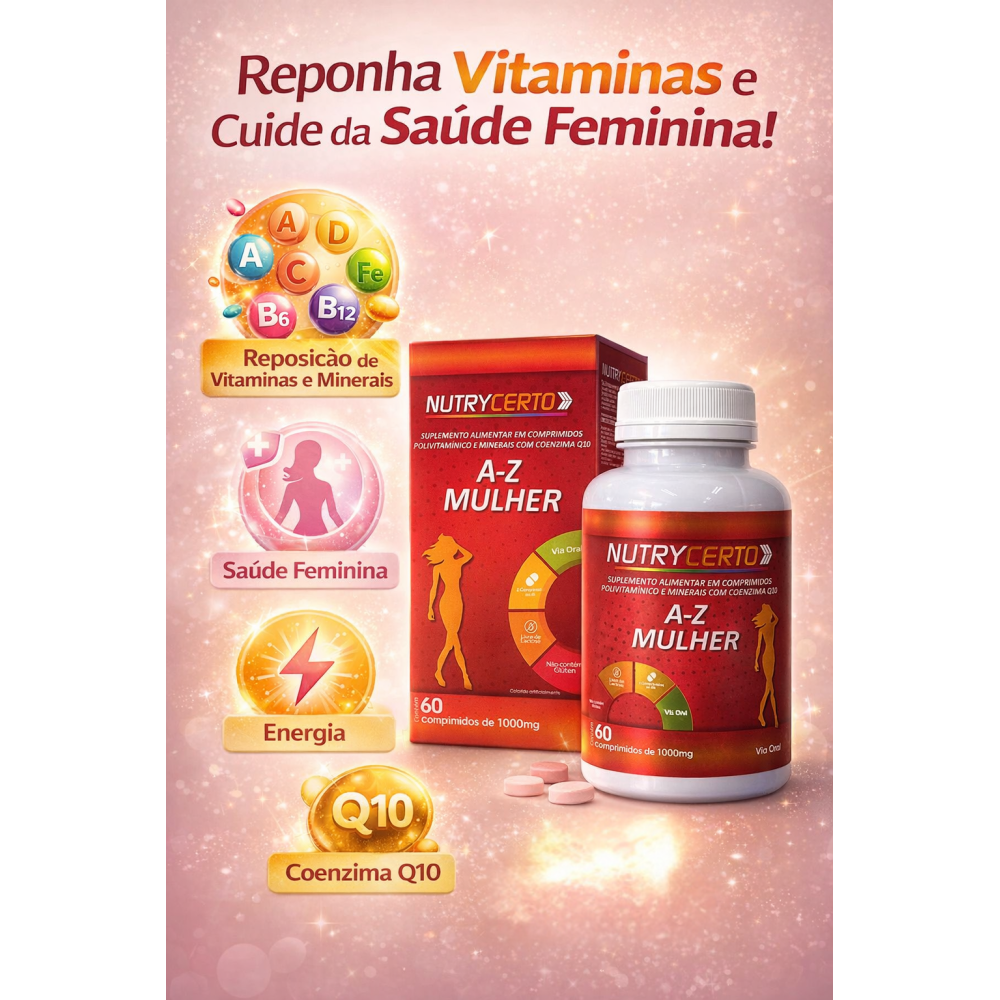 O Nutrycerto A-Z Mulher é um suplemento alimentar desenvolvido especialmente para atender às necessidades nutricionais do público feminino. Sua fórmula reúne vitaminas e minerais essenciais que auxiliam no metabolismo energético, na imunidade e no equilíbrio do organismo.