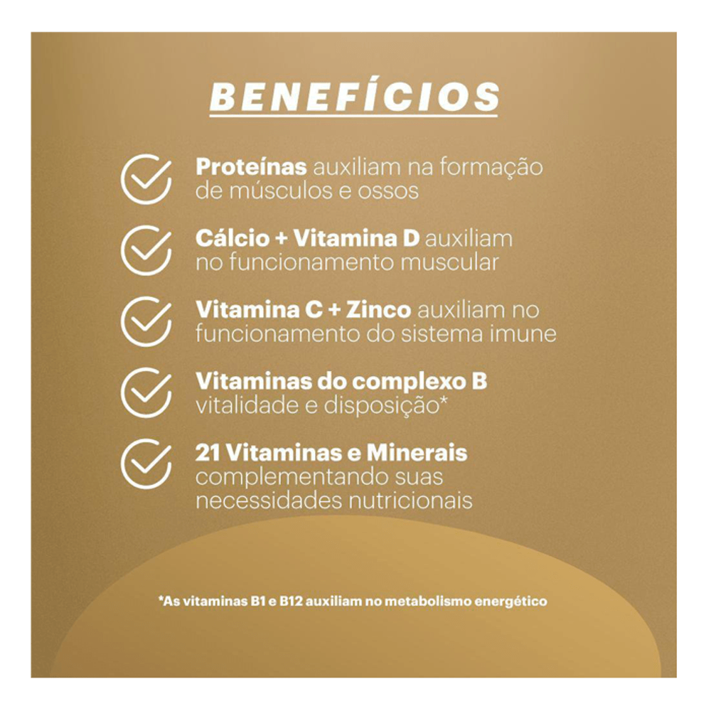 Sua fórmula contém proteínas, vitaminas e minerais essenciais que ajudam a complementar a alimentação diária, contribuindo para a manutenção da força muscular, energia e disposição.