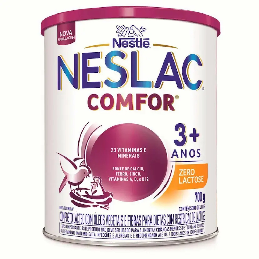 O Nestlé Neslac Comfor Zero Lactose Sem Glúten 700 g é um composto lácteo/alimento lácteo em pó desenvolvido para crianças de 3 a 5 anos. Com zero lactose e sem glúten, auxilia na rotina alimentar com dissolução fácil e sabor suave, ideal para o café da manhã e lanches — sempre com orientação do profissional de saúde.