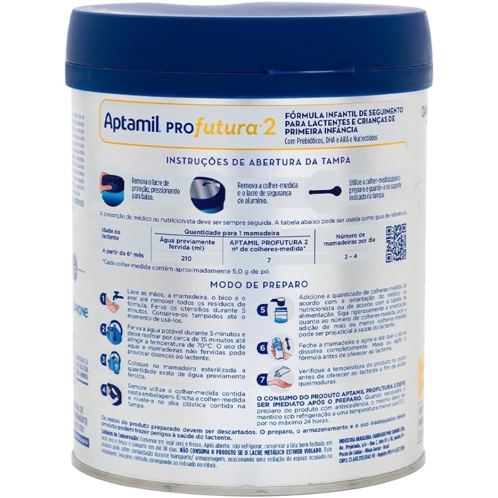 A Aptamil Profutura 2 Danone 800 g é uma fórmula infantil de seguimento para bebês de 6 a 12 meses, indicada quando o aleitamento materno não for possível ou precisar ser complementado, sempre com orientação do profissional de saúde. Embalagem de 800 g, com preparo prático e instruções claras no rótulo, em conformidade com a legislação vigente para fórmulas infantis.