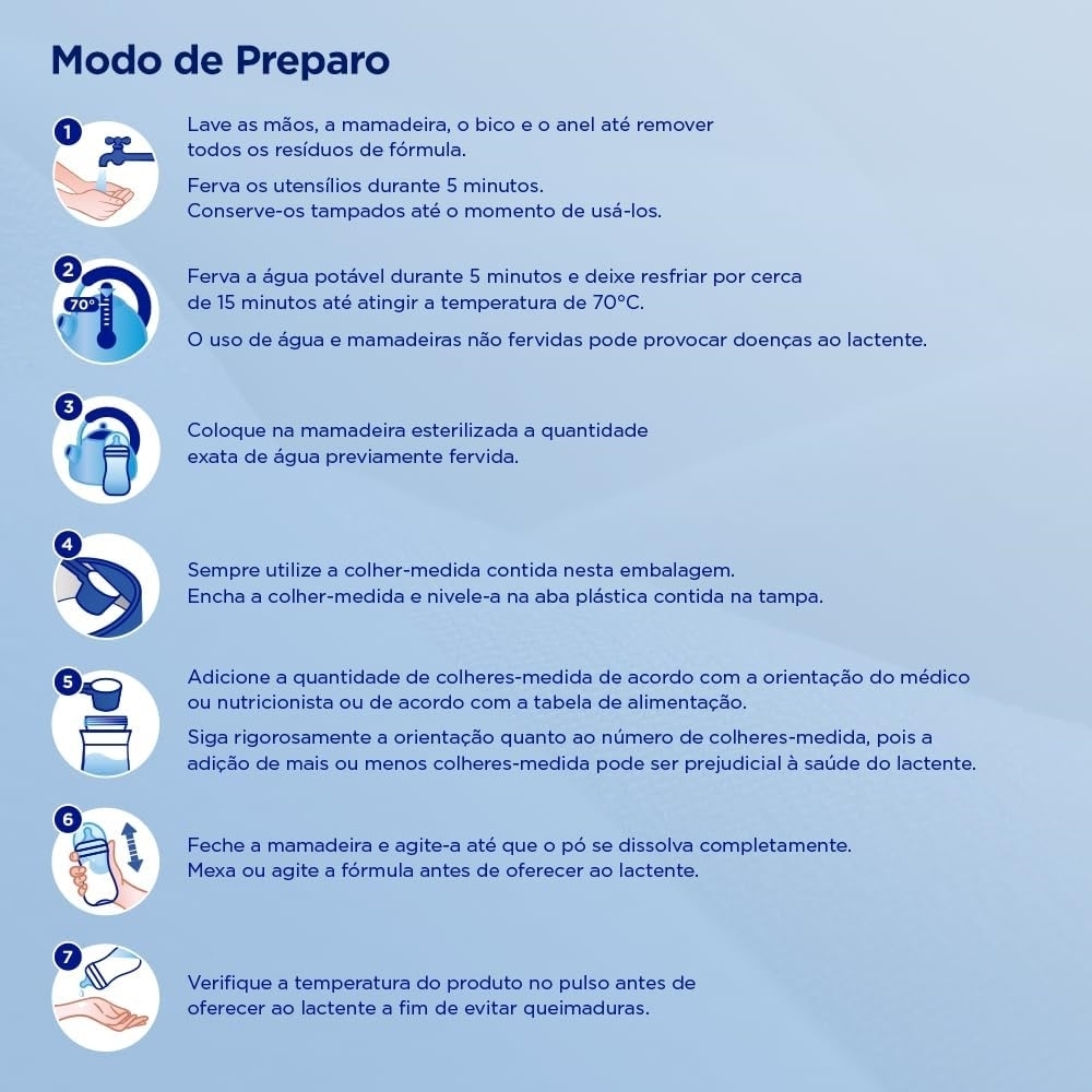 Advertências: o aleitamento materno é recomendado. Use esta fórmula apenas sob orientação de médico ou nutricionista. Não indicada para menores de 6 meses. Não aquecer a mamadeira no micro-ondas. Manter fora do alcance de crianças.