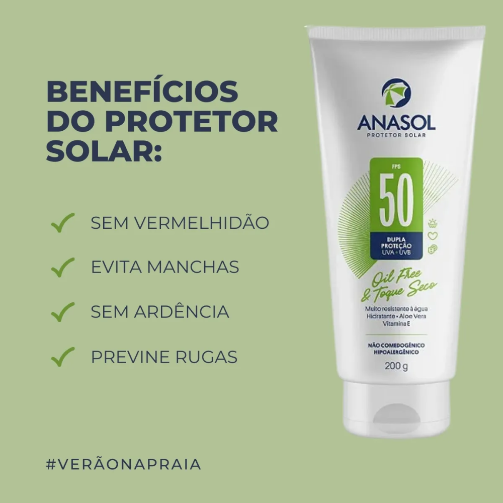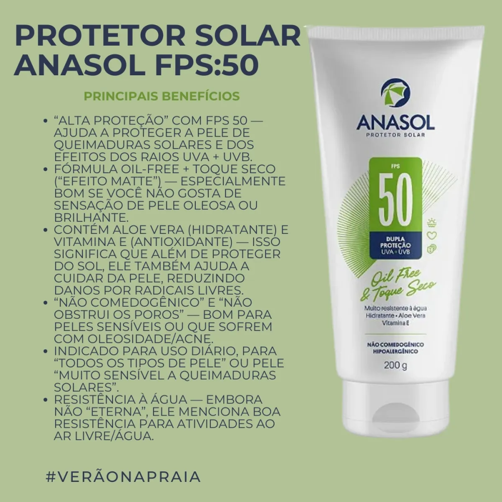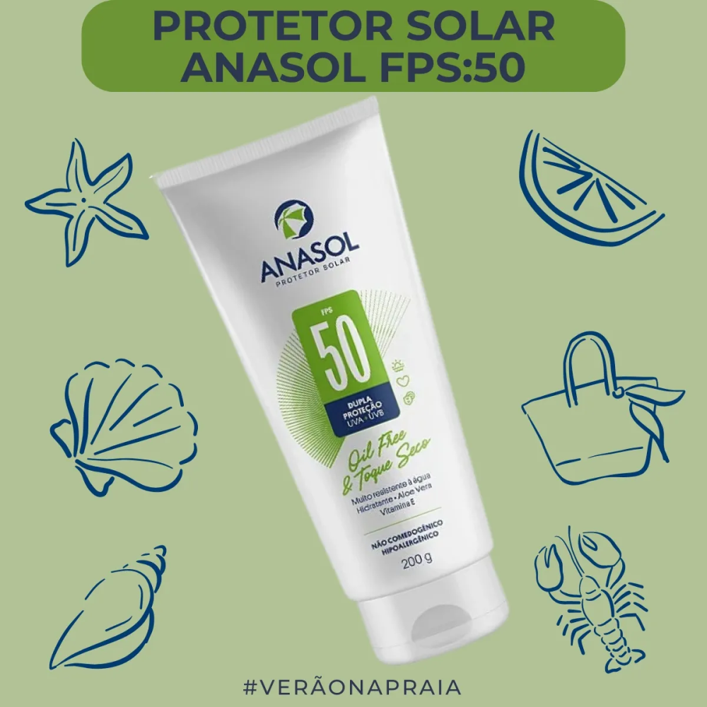 O Anasol Protetor Solar FPS 50 Loção 200 g oferece alta proteção contra raios UVA/UVB, ajudando a prevenir queimaduras solares e o fotoenvelhecimento. A textura leve de rápida absorção deixa toque confortável, sem esbranquiçar, e a resistência à água e ao suor traz praticidade para o dia a dia. Indicado para uso corporal e áreas expostas.