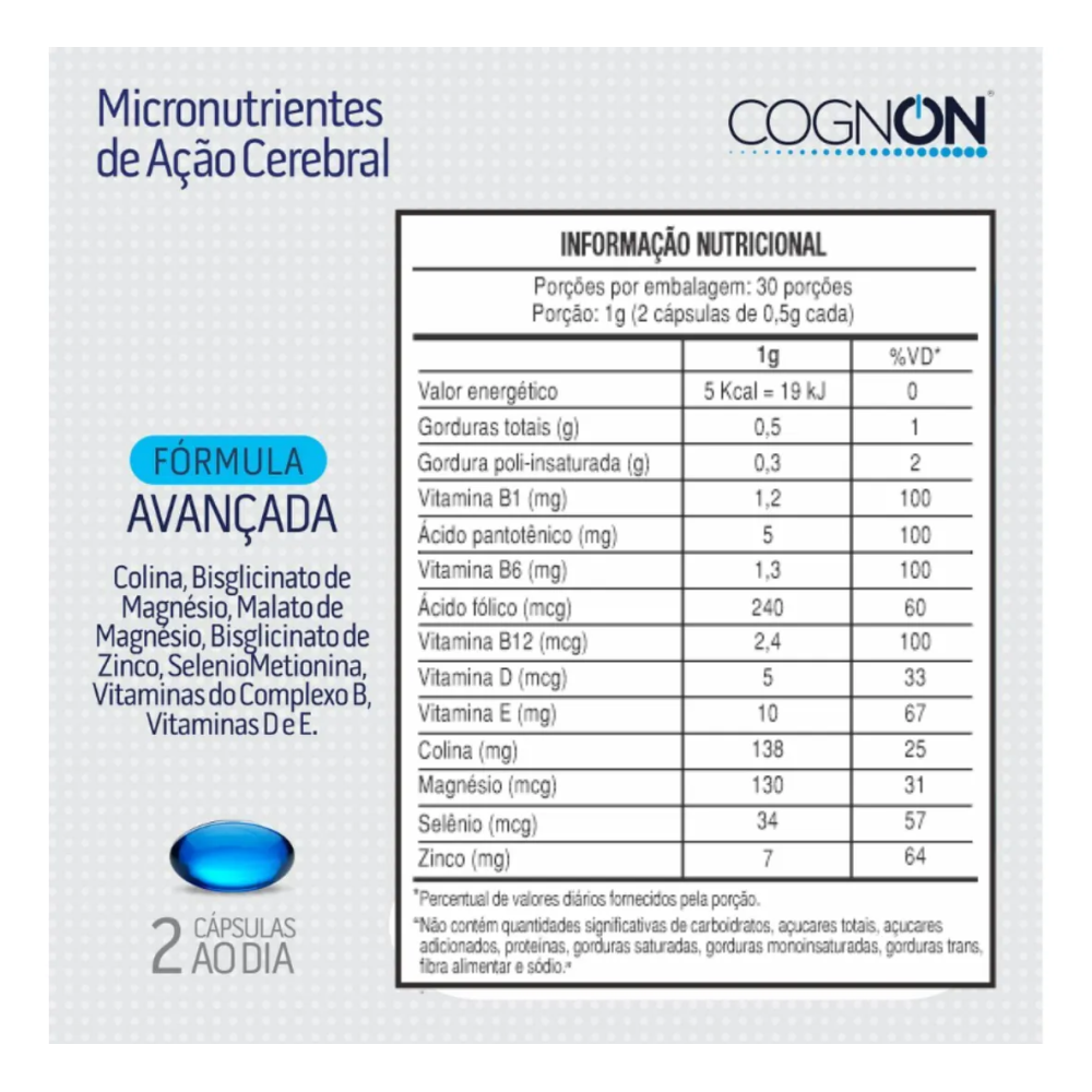 O Suplemento Alimentar Cognon com 60 Cápsulas Gelatinosas foi desenvolvido para complementar a alimentação diária, auxiliando na ingestão de nutrientes importantes para o bom funcionamento do organismo. Sua apresentação em cápsulas gelatinosas facilita a ingestão e a rotina de uso. Indicado para adultos que buscam suporte nutricional no dia a dia, conforme orientação de um profissional de saúde.